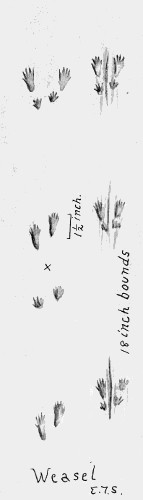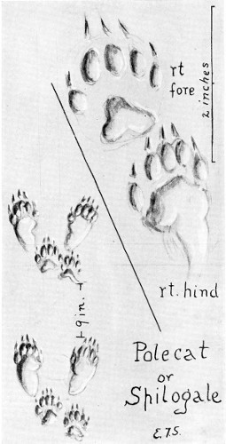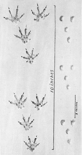 This track cannot be distinguished with certainty from that of a small dog (see pages 596 and 597). The greater size of the side toes in the hind track I have often noticed, but there is no corresponding disproportion in the animal’s foot.