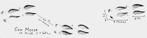 The great size, the pointed shape, and the long stride usually distinguish it from the track of a domestic cow. Ordinarily, the clouts do not show. The dung pellets, however, are very important diagnostics. They are cylindrical, about ⅝ inch through and 1¼ inches long. Probabilities of time and place must always be considered. Oftentimes the hind foot is set far ahead of the front-foot track. The excessive spreading of the hoofs is a strong character of moose tracks.