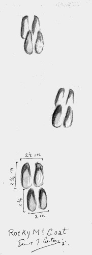 Kinship with sheep and antelope is reflected in the track of the goat. Its heel-pads are so large and rubber-like that the track is rarely so sharp as here shown. “Although marvelously surefooted and fearless in traversing the faces of high precipitous slopes, goats lack the springy grace and vivacity of mountain sheep and move with comparative deliberation.”