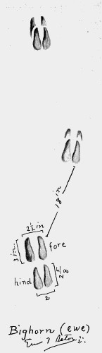 The general style of a bighorn track is like that of deer, but the toes are finished off more squarely and the hollow in the outer edge of each hoof is a strong characteristic. Sometimes the tracks are in correct register. The clouts rarely show. The dung pellets are like those of the deer, but rounder. The track is that of a ewe; the ram’s is similar, but larger. 605