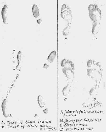 The footprints of the human animal are included in this series of sketches for the purpose of comparison. Especially interesting is the similarity to be noted between the tracks made by man and those of the grizzly and the black bear (see page 608). The tracks shown on the left half of this page present the moccasin-shod footprints of a Sioux Indian compared with the shoe tracks of a white man. On the right are shown: (A) a woman’s foot which has been much pinched by tight shoes; (B) a sturdy boy’s foot, somewhat too flat to be normal; (C) the footprint of a slender man, and (D) the imprint of a robust man’s foot. 610