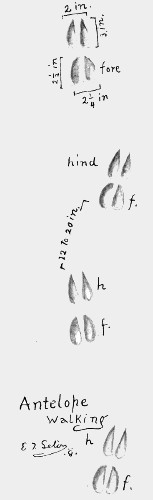 The different styles of front and back feet is a marked character of the antelope’s track and is best seen in the walk. In galloping all of these animals leave the hind tracks ahead of the fore tracks, but disturb the ground, so that almost no characteristic marks are to be seen. 612