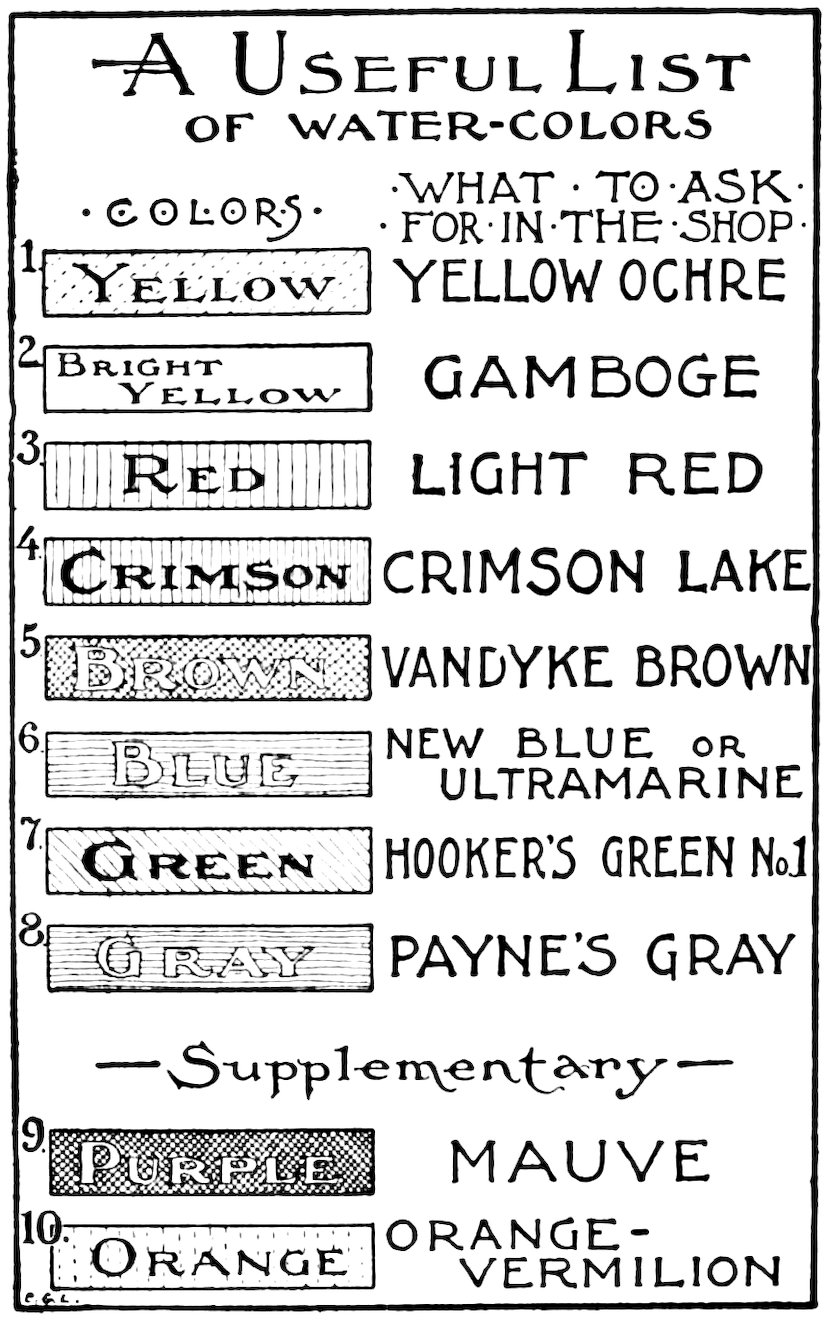 Here is a good list of colors for practical work. The first eight are enough for every purpose; but add, if you wish, purple and orange. Moist colors in pans are best. There are many different kinds of red, green, blue and brown paints; and as you may be puzzled and not know what to get, the names of the best hues of these particular colors are also given. The most useful paints in this list are yellow ochre, light red, Vandyke brown and Payne’s gray. Learn to work with them, use them often and see the beautiful effects they produce. Delicate tints are made with thin washes of yellow ochre and light red. Vandyke brown makes a variety of pleasing tints.