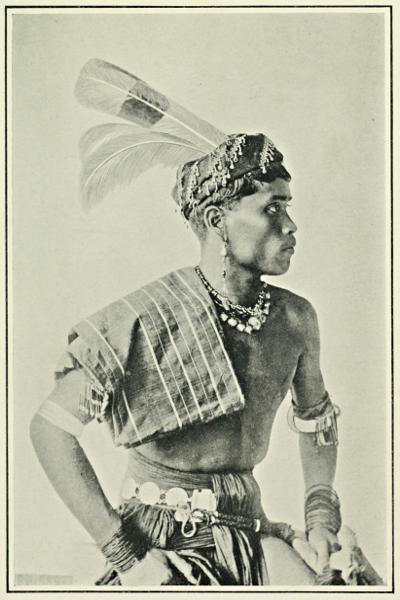 She has in her hair a comb decorated with silver filigree work. Round her neck is a necklace of beads. The rings round her body are made of hoops of cane, round which little brass rings are arranged close together so that none of the cane is visible. These hoops are worn next to the body above the waist, and over the petticoat below. The silver coins fastened to this brass corset, and worn as belts round it, are the silver coins of the country. The petticoat is a broad strip of cloth, sewn together at the ends and having an opening at the top and bottom. It is fastened at the waist with a piece of string.