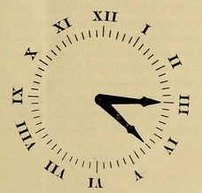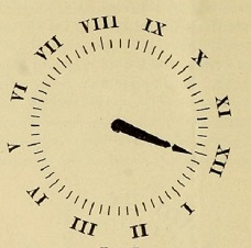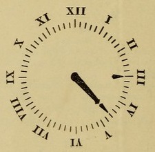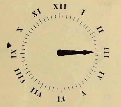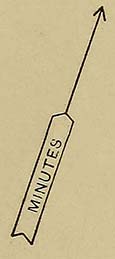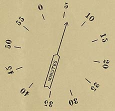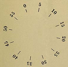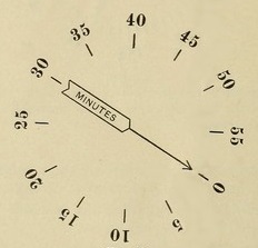 There was still something to be desired. The counting of the minutes along the measuring arc was a waste of time, if the value of the arc could in some way be directly indicated. If the hand were set back to 12 o'clock for the initial imprint, the final imprint would show the hand pointing directly at the minute whose number on the dial is the value of the period, and it would not even be necessary to count. But the setting[ 11] of the hand back to zero would prevent its making the final imprint of any previously begun record, so that the machine could only be used for one record at a time. It was desirable to have a machine that would record any number of overlapping intervals at the same time, so that one machine would record the intervals of all the telephone conversations under the control of a single operator, or rather of two operators, because both of them could reach the same machine. So it wouldn't do to set the hand back to zero, as the hand must rotate constantly and uniformly. Then why not set the zero up to the[ 12] hand at each initial imprint? This meant making the dial rotatable, as well as the hand. It gave an initial record like that shown in Fig. 6.