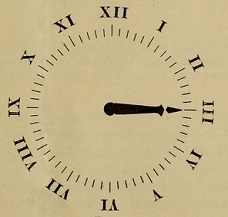 The prior machine from which the calculograph was evolved is the time-stamp, a printing machine having a stationary die like a clock dial and having a rotating die like the hand of the clock, as in Fig. 1. The small triangle outside the dial is the hour hand, it being placed outside the dial because it is necessary[ 9] that the two hands shall be at the level of the face of the dial and yet be able to pass each other. The hour hand may be disregarded here, as the records needed are almost never an hour long. The manner of using the time stamp to determine the value of an interval was to stamp the time of day at the beginning of the period, and then to stamp the time of day at the close of the period at another place on the paper, as shown in Fig. 2, and finally mentally to subtract the one time of day from the other to get the value of the period.