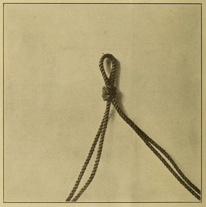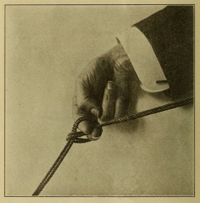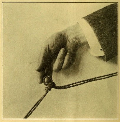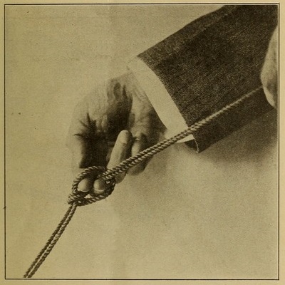The first step was to select the knot which could be tied by the simplest motions. The knot which the inventor selected is that shown in Fig. 10, and is a form of bow-knot.