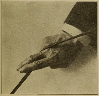 The problem was to find how this knot could be tied with the smallest number of fingers, making the smallest number[ 15] of simple movements. As anyone would ordinarily tie even this simple knot, the movements would be so numerous and complex as to seem impossible of performance by mechanism. The inventor, by study of his problem, found that this knot could be tied by the use of only two fingers of one hand, and by very simple movements. The knot will best be understood by following the motions of these fingers in tying the knot. Using the first and second fingers of the right hand, they are first swept outward and backward in a circular path against the two strands of the cord to be tied, as shown in Fig. 11.