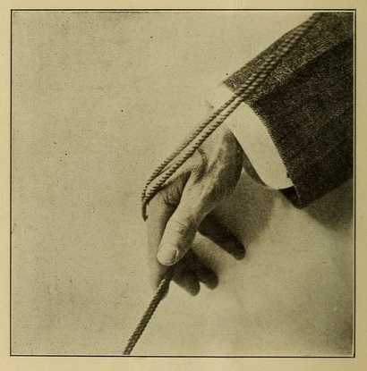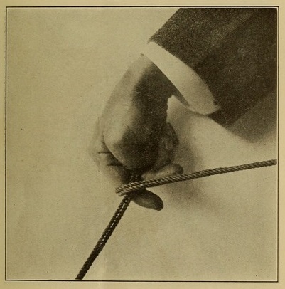 The fingers continue in their circular motion backward, so that the strands of the cord are wrapped around these fingers, as shown in Fig. 12.