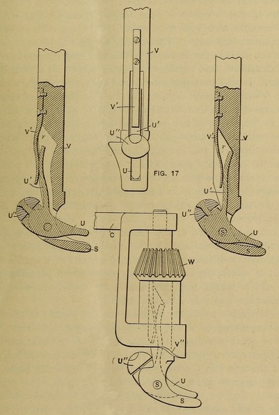 The index finger of the hand is represented by the finger S, which is integral with the shaft V. The second finger of the hand is represented by the finger U, which is pivoted to the first finger by the pin s. The grasping movement of the finger U is accomplished by a spring V' bearing on the shank U',[ 18] and its opening movement is caused by the travel of an anti-friction roll U", on the rear end of the pivoted finger, over a cam V", on the bearing of the shaft. The shaft is rotated by the turning of a bevel pinion W on the shaft through the action of an intermittent gear. The necessity of drawing the fingers backward to accomplish the movement between Figs. 14 and 16 was avoided by causing the tied bundle to have a motion away from the fingers as it is expelled from the machine, the relative motion between the fingers and the knot being the same as if the fingers drew back.