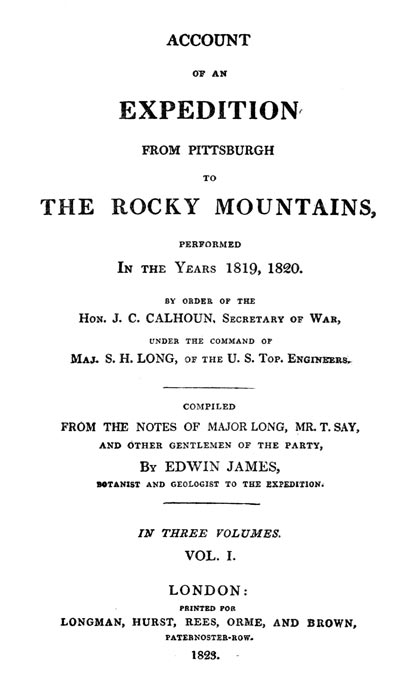 | Account of an Expedition from Pittsburgh to the Rocky Mountains, performed in the Years 1819, 1820. By order of the Hon. J. C. Calhoun, Secretary of War, under the command of Maj. S. H. Long, of the U. S. Top. Engineers. Compiled from the Notes of Major Long, Mr. T. Say, and other Gentlemen of the Party. [Part I, being chapters i-x of Volume I of the London edition, 1823.] Edwin James, Botanist and Geologist to the Expedition | |