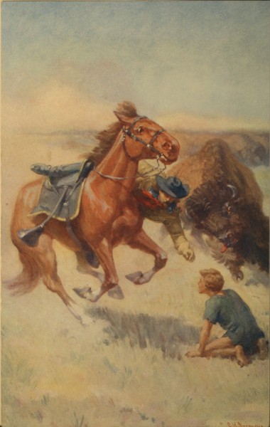 However, he was not afraid of the largeness; and as he hastened as fast as he could, with ear alert for sunning rattlesnakes and eye upon a vast herd of buffalo grazing far to the northeast, he was rather glad of the loneliness. Moving objects, ahorse, might mean Indians, and Indians he did not want. Ah no, no, no.