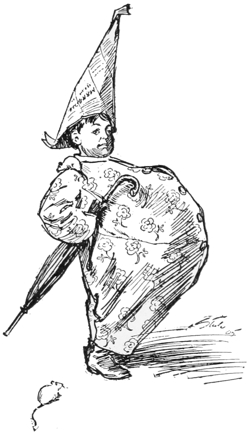 The uniform in question was composed of a pair of your linen knickerbockers with a red tape tacked along the outside seam, and a huge six-pointed blue flannel star, each point having a buttonhole whereby it was attached to a button, corresponding, on the breast of your waist. And was there a cap, or did you wear the faithful old straw? Fat Day, you recollect, had a cap upon the front of which was lettered his rank—“Captain.” It seems as though mother made you a cap, as well as the striped trousers and breastplate. The cap was furnished with a tremendously deep vizor of pasteboard, and was formed of four segments, two white and two blue, meeting in the center of the crown.