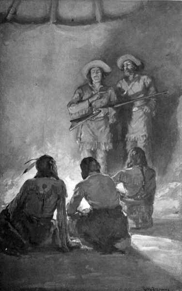 “He says he’s always been friendly to the whites. ’Fore that gang started from the village they held a council, an’ most of ’em voted to attack us, ’cause we’d been with the Utes, an’ like as not had sold ’em guns an’ ammunition. But the Sioux, an’ a few[297] ’Rapahoes who’d seen us last year on the plains, an’ knew about us, voted ag’in it. He says the Sioux air pore, an’ ought to be given a lot o’ valuable presents for the way they voted. I expect the ’Rapahoes’ll want as much.”