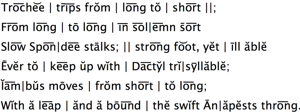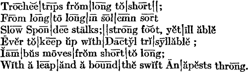 [11]Coleridge here illustrates the feet while explaining them, an admirable device in exposition. “Dactyl” is a fine word; in Greek it means “finger”; like a finger, a poetic dactyl has three parts, one long and two short. “Anapest” comes from a Greek verb which means “strike back”; an anapest is a reversed dactyl. Most English poems are written in iambi. Longfellow’s Hiawatha is in trochees, Evangeline in dactyls, and The Destruction of Sennacherib (see page 70) in anapests.