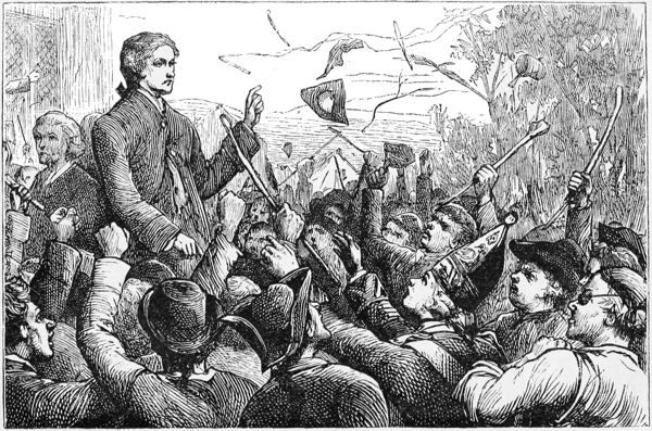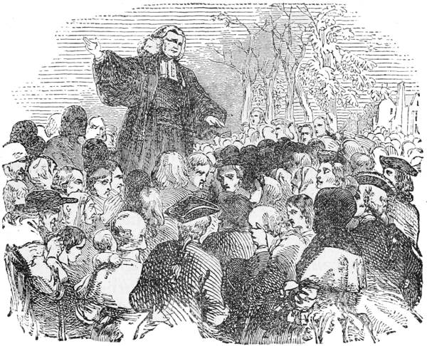 Southey[5], in his certainly not impartial volumes, admits that, for the most part, the condition of the clergy was dreadful; it is not wonderful that they closed their churches against the innovators. There was, for instance, the Vicar of Colne, the Rev. George White; when the preachers came into his neighbourhood, it 72was his usual practice to call his parishioners together by the beat of a drum, to issue a proclamation at the market-cross, and enlist a mob for the defence of the Church against the Methodists. Here is a copy of the proclamation, a curiosity in its way: “Notice is hereby given that if any man be mindful to enlist in His Majesty’s service, under the command of the Rev. Mr. George White, Commander-in-Chief, and John Bannister, Lieutenant-General of His Majesty’s forces for the defence of the Church of England, and the support of the manufactory in and about Colne, both which are now in danger, let him repair to the drumhead at the Cross, where each man shall receive a pint of ale in advance, and all other proper encouragements.” Such are some of the instances, which might be multiplied to any extent, showing the reception given to the revivalists by the clergy of the time. But let no reader suppose that, in reciting these things, we are willingly dwelling upon facts not creditable to the Church, or that we forget how many of her most admirable members have made an abundant amende honorable by their eulogies since; nor are we forgetting that Nonconformist chapels, whose cold respectability of service and theology were sadly outraged by the new teachers, were not more readily 73opened than the churches were to men with whom the Word of the Lord was as a fire, or as a hammer to break the rock in pieces.[6] Whitefield soon felt his power. Immediately after his ordination, he in some way became for a time an occasional supply at the chapel in the Tower; he found a straggling congregation of twenty or thirty hearers; after a service or two the place was overflowing, and remained so. During his short residence in that neighbourhood the youth continued throughout the whole week preaching to the soldiers, preaching to prisoners, holding services on Sunday mornings for young men before the ordinary service. He was still ostensibly at Oxford; a profitable living was offered to him in London, and instantly declined. He went to Gloucester, to Bristol, to Kingswood. Of course it is impossible to follow Whitefield step by step through his career; we can only rapidly bring out a crayon sketch of the chief features of his work. He made voyages to Georgia; voyaging was no pastime in those days, and he spent a great amount of time in transit to and fro on the seas; our business with him is chiefly as the first field-preacher; and Kingswood, near Bristol, appears to have been the first place where this great work was to be tried. It was then, what it is still, a region of rough collieries, 74the Black Country of the West; the people themselves were of the roughest order. Whitefield spoke at Bristol, to some friends, of his probable speedy embarkation to preach the Gospel among the Indians of America; and they said to him, “What need of going abroad to do this? Have we not Indians enough at home? If you have a mind to convert Indians, 75there are colliers enough in Kingswood!” A savage race! As to taking to the fields in this instance, it was simply a necessity; there were no churches from whence the preacher could be ejected. Try to realize it: the heathen society, indoctrinated only in brutal sports; the rough, black labour only typical of the rough, black minds, the rough, black souls. Surely he must have been a very brave man; nor was he one at all of that order of apostles whose native roughness is well fitted, it seems, to challenge roughness to civility.