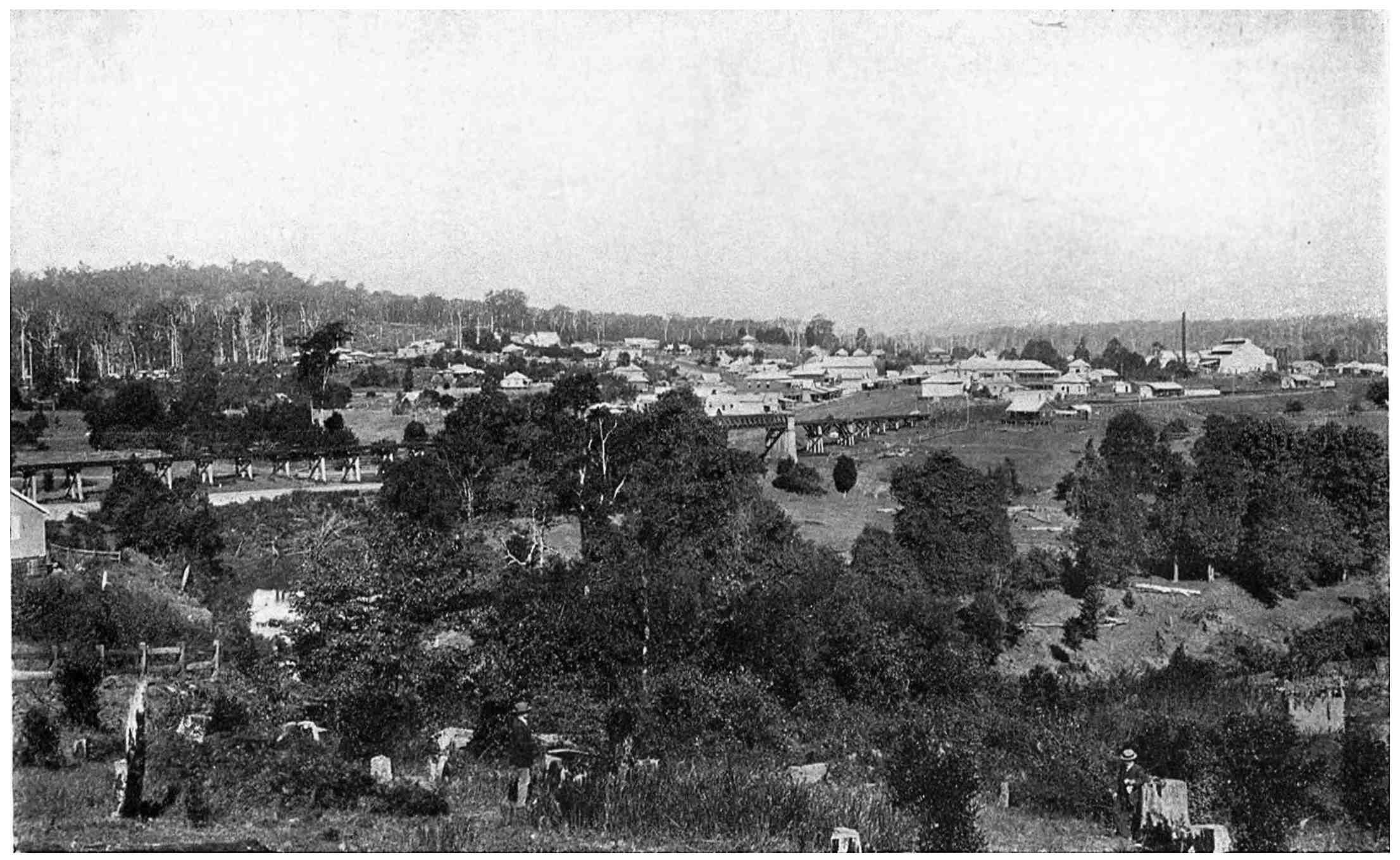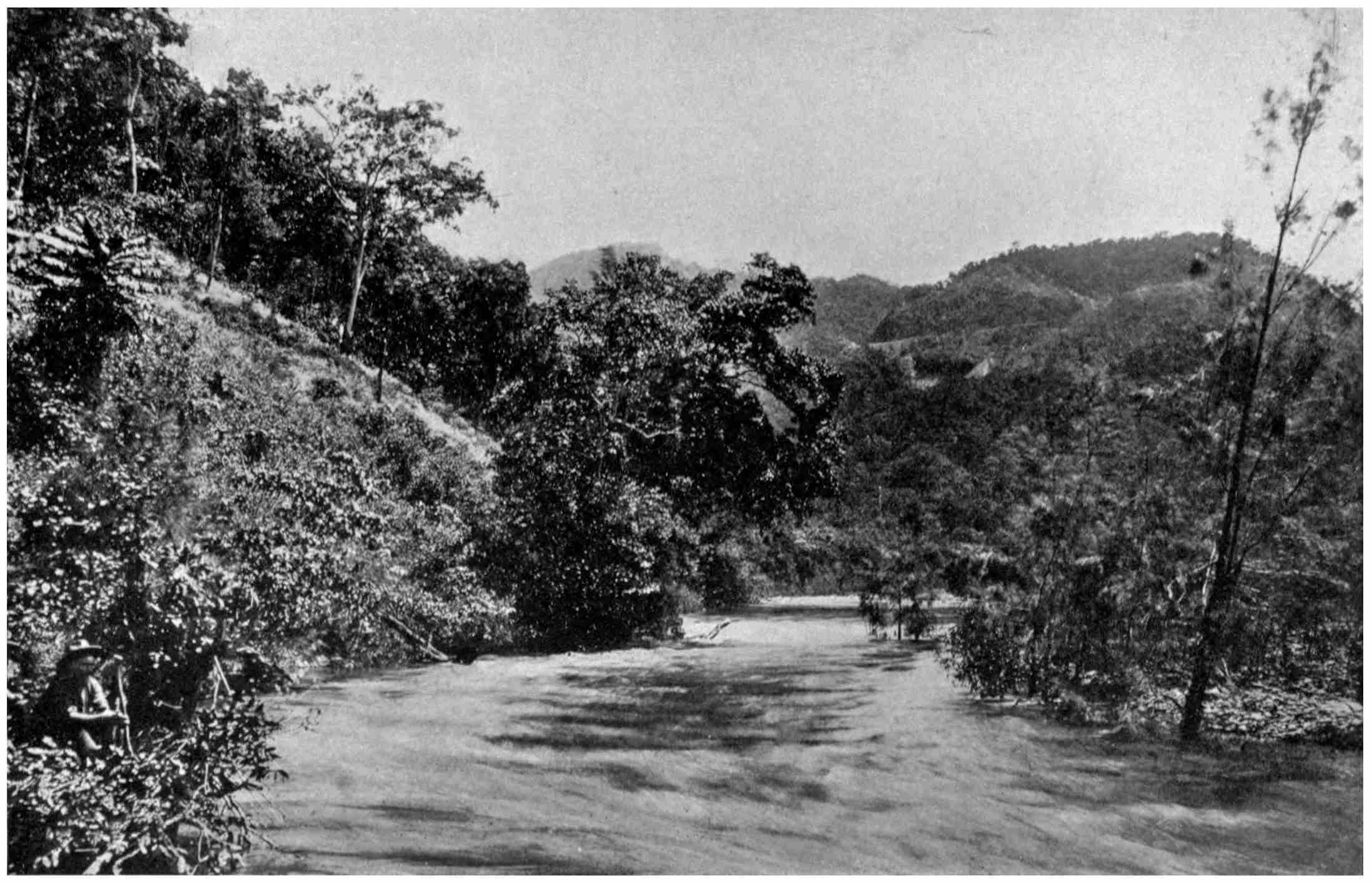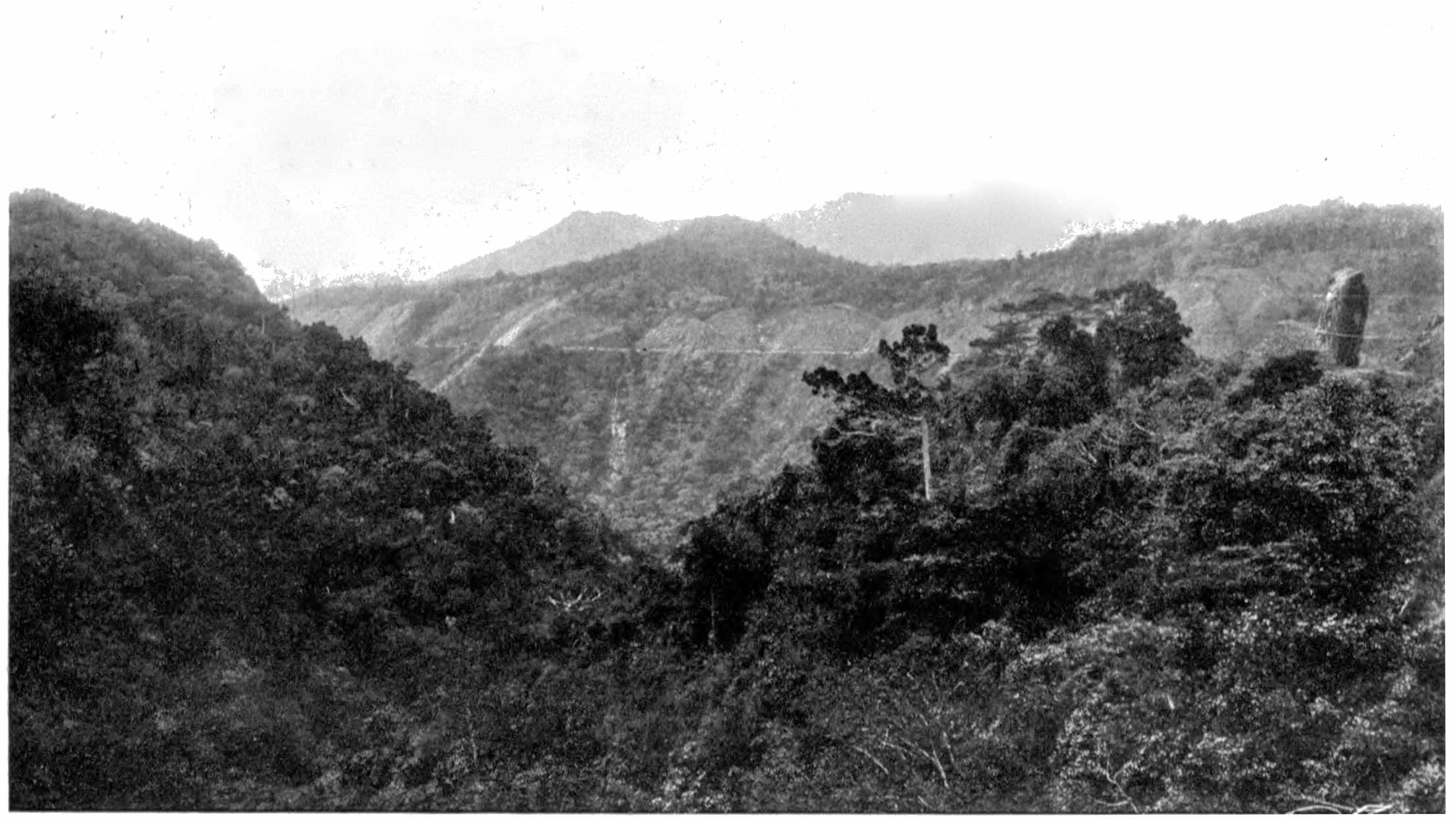 The line from the wharf runs among the houses257 to the station, where the school children were just arriving from up country settlements. After passing some tea gardens, which looked oddly sophisticated in the bush, we found ourselves among banana fields and pineapples, but everything was more or less obscured by fine driving rain. There was still a fair number of scattered houses, built of wood and iron, with a deplorably drenched air, and handfuls of draggled English flowers in their little gardens among tropical fruits, paw-paws, and lemons. When the ascent begins the line soon enters the wonderful tropical forest—indescribable, unimaginable in the abounding luxuriance and the variety of its tangled, matted growth. The stately soaring eucalyptus is always the staple factor in Australian scenery, but here they are linked together and festooned with heavy ropes of giant creeper, “vines” they call them in the tropics.