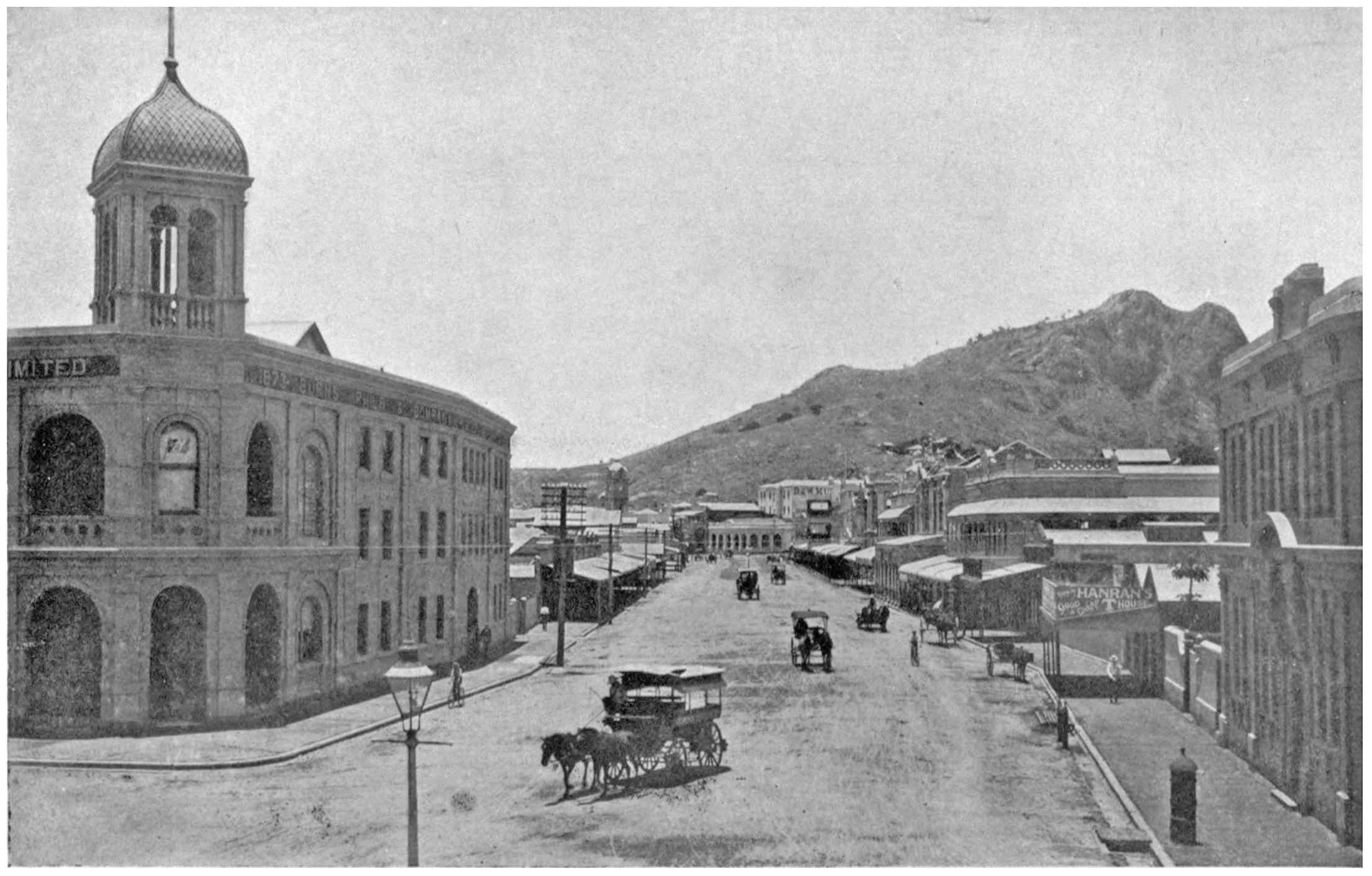 The second day of our stay there, we climbed the granite peak that rises behind the town, going across by a little ferry-boat that plies between the wharf and the opposite side of the harbour. A strong wind was blowing in from the sea, as we steamed across to Townsville, lying deep in dust in the hot sun. We made our way up to the Castle Hill, the red granite peak that dominates the town. A very steep path leads up to it, and on the rocks above some goats and253 kids were silhouetted against the clear blue sky like a scrap of Swiss scenery. The town from this side is scattered along the shore, and the slopes above it half hidden in tropical foliage. Below us were the Botanical Gardens, the hospital embowered in trees, with the patients lying out on a shady balcony. Everywhere was the heavy scent and glorious bouquets of gold and white frangipani. We had been sent in the wrong direction, and missed the path, so that the ascent was very steep and rough, but we went on, slipping and scrambling up among falling stones, clinging on where we could, among big butterflies and lizards, and large brown grasshoppers with black spots. As we climbed higher Townsville spread itself out beneath us charmingly. Bungalows nestled among vivid green foliage, beyond were the blue bay, and its boats, ours amongst them, riding gaily at anchor, with the dark green wooded mass of “Magnetic Island” rising behind. Higher still we rested, while a fish hawk soared far above in the clear blue, and on the southern side Townsville looked like nothing but a vast mud flat with the river winding through it, and houses dotted among the mangrove swamps. One fancied that one big wave might submerge the whole.