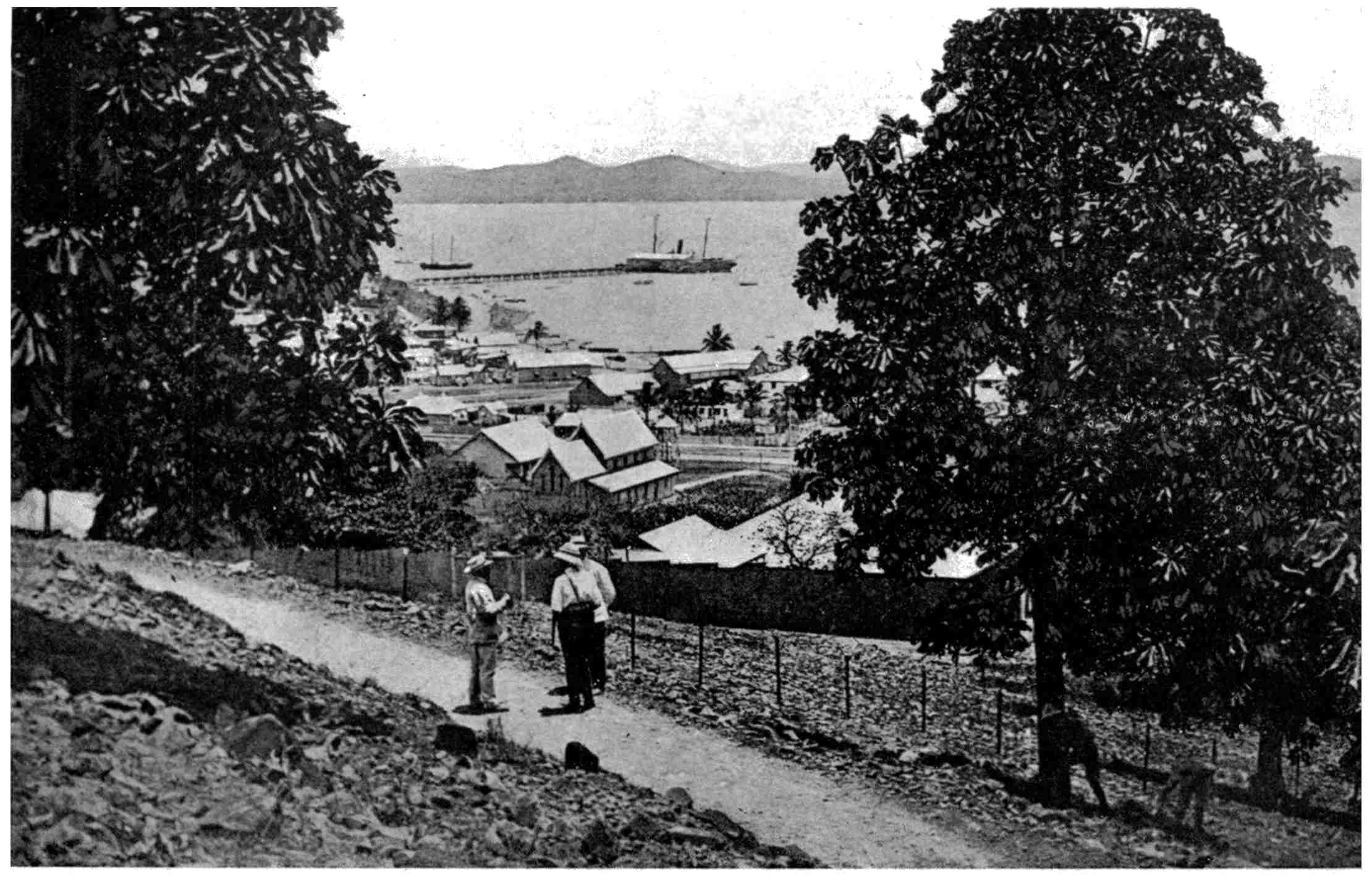 The approach to Port Darwin is charmingly pretty. The tropical vegetation that comes down nearly to the water’s edge is a vivid green, and the cliffs that fringe the shore a warm red. The tops of quite important-looking houses were showing among the trees.