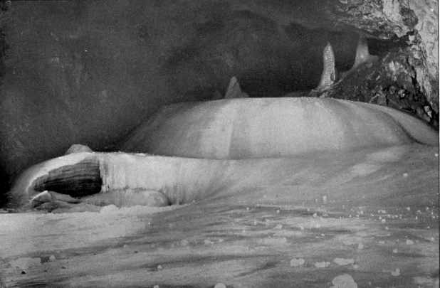A pool of water, perhaps thirty centimeters in depth and three or four meters in diameter, lay at one place on the ice floor. The whole cave was damp and the ice in places decidedly slushy, in fact all the signs showed that it was thawing. In the case of this glacière as well as in those of the Mont Parmelan, it seemed clear that it must be in the winter months that the formation of ice takes place.