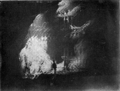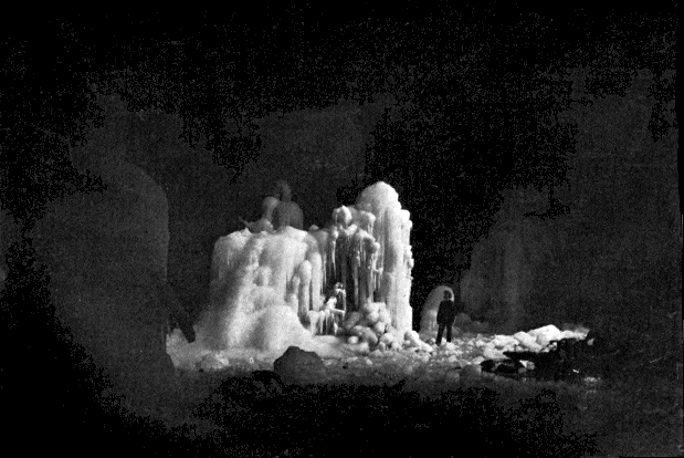 The bottom of the cave was entirely covered with a flooring of ice. How thick this flooring was there was no means of judging, as there were no holes, but it must « 12 » have been at least two or three meters thick in places. At the back of the cavern, directly facing the entrance, one magnificent frozen water fall streamed from a fissure. It was perhaps five meters high, and began to take the fan shape from its origin. The base was about four meters wide, and did not rest on the ice floor, but on a sloping rock extending out from the side of the cave.