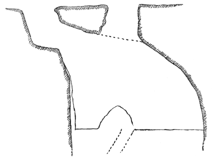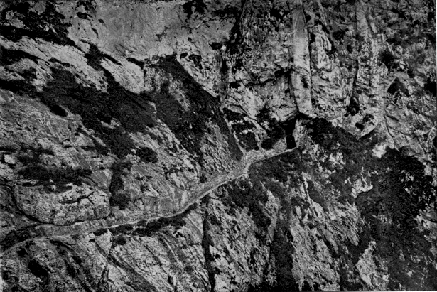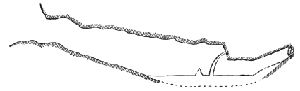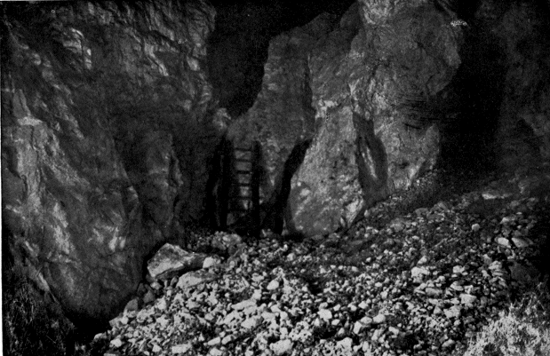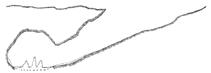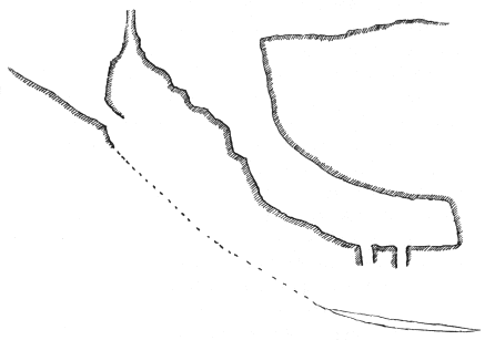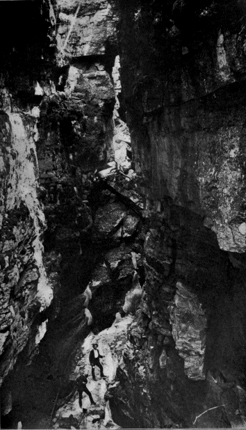 The fissure led straight into the mountain. It was a couple of meters wide at places, and there we moved along the bottom. In one place it narrowed below to a wedge, and there we progressed either by climbing along one side or by placing one foot on one side and the « 7 » other foot on the other. The fissure led downwards as well as inwards. It would have been nothing in daylight to go through it; but in the semi-darkness it was not easy.