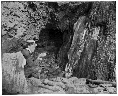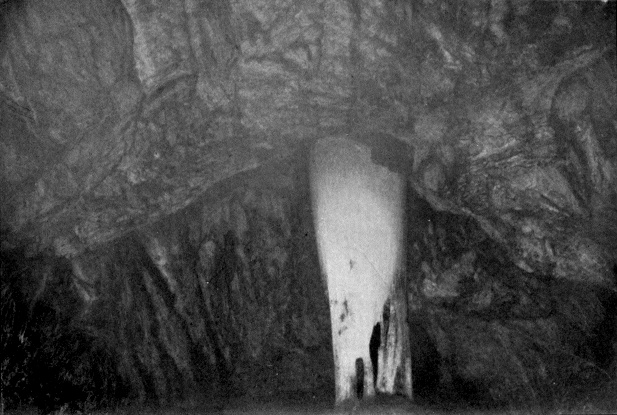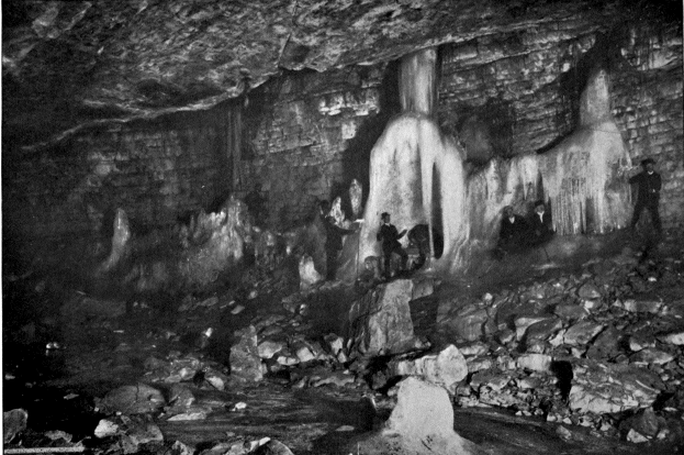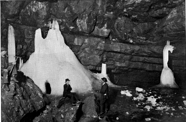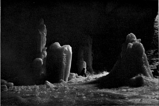 Perhaps the most remarkable feature of all, were six or seven great ice stalagmites, shaped like cones or rough pyramids, which rose on the floor of the cave. One of these was at least five meters in diameter and six in height, and seemed perfectly solid. In the case of two of the others, however, the cones were broken on one side, revealing in each the stem and branches of a young pine tree. These evidently had been planted in the ice and round them the columns had grown. Whether all the ice cones were thus artificial in their origin I could not determine, but it seemed probable that they were the result of years of undisturbed accretion and growth. In both the cones where the break on the side gave a view into the interior, the dark blue-green color of deep glacier crevasses was present.