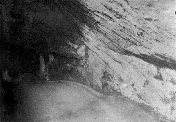 The entrance to the glacière was in a wall of rock, set at an angle of some thirty-five degrees; at the bottom of this there was some grass. An easy chimney some fifteen meters high led up to the glacière. Up this chimney we climbed. At the top we entered a little cave about two meters deep, by a sort of portal about two meters wide. The cave made an elbow to the right, and passing this we found that it turned to the left and pointed directly into the mountain. The rock went down vertically in front of us, but the boy said we could get down, so having first lowered a candle by a string to see the depth, which turned out to be a perpendicular drop of some four or five meters, with the help of the rope we all climbed down. We were already almost entirely away from the daylight and a few steps took us into complete darkness, except for the light we had from the candle each of us held in his hand.