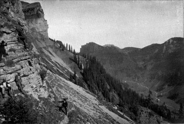 Our guide led us for about an hour across the plateau in a southerly direction, and then, looking over the side of the Parmelan, with a sweep of the arm covering south, west and north, he told us that the glacière lay between those points, but he did not know exactly where. This seemed a rather hopeless prospect, so, as we had no clue to the whereabouts of our prospective hole, we descended to a couple of châlets we saw some two hundred meters below, but which at least were in the direction of Annecy. We followed a goat-herd’s path which led to the châlets from the plateau, one of those dangerous grass tracks, where nothing would be easier than to make a slip, and where a bad slip might have unpleasant results. This is, however, just the kind of « 6 » place where every one is particularly careful not to slip. We were careful and so reached the châlets all right, and there we found a strong, intelligent boy, who at once pointed out the place where the glacière was, about half way up the slope we had just come down. So we took him with us, leaving our guide at the châlets to await our return.