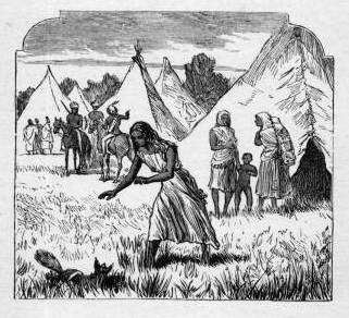 I am sorry to say my lady friend on the right, this chieftainess, had very dirty-looking hands, and long, strong, brilliant teeth. She took her piece of meat, and, turning it over and over in her hands, began tearing and cutting at it in a way that was not very dainty, but extremely otherwise. After biting off a few mouthfuls, she threw it down on the dirty ground of the wigwam before her, and, inserting one of her greasy hands in the bosom of her dress, she pulled out a large piece of soiled paper, and, unfolding it before me, she began in excited tones to tell me how she had kept the tally of the “praying days,” for thus they style the Sabbath. Greatly interested in her story, and in her wild joyous way of describing her efforts to keep her record correct, I stopped eating and looked over her paper, as she talked away. Imagine my great delight to find that through the long months which had passed since I had given her that paper and pencil, she had not once missed her record. This day was Thursday, and thus she had marked it. Her plan had been to make six short marks, and then a longer one for Sunday.
