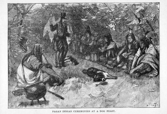 They were indeed anxious for instruction in spiritual things. I read and, through my interpreter, explained truth after truth, to which they gave the most earnest attention. Then we stopped a little while, that we might have dinner. As I and my men were the guests of this chieftainess I did not get out my tin plates, and cups, and knives and forks, but sat down beside her in her wigwam with the rest of the people, completing a circle around the big wooden dish, in which the large pieces of cooked reindeer heads had been thrown. I asked a blessing on the food, and then dinner began. The plan was for each person to help himself or herself to a piece of the meat, holding it in the hand, and using hunting knife or teeth, or both together, to get off the pieces and eat them.
