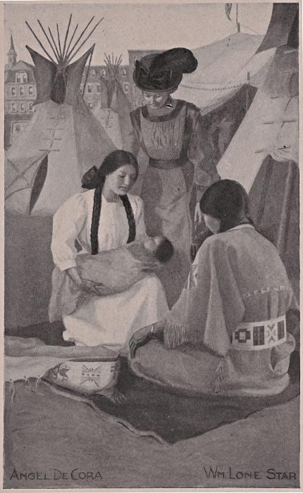 Within eighteen months, she had become quite the autocrat of her own little village—old Standing Cloud being merely the figure-head. She had drilled her small household with infinite patience—and not without a long siege with Grandmother—to such “civilized” habits as regular meal-times, sitting down[258] at table, and a weekly wash-day. The children’s bath night was duly observed, even though the ceremony must take place in a wooden wash-tub beside the kitchen stove.