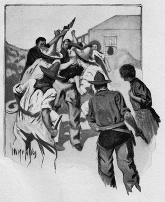 Next thing, two ’r three of the boys got into a reg’lar jawin’-match over some property. Chub Flannagan wanted to start a new paper called the Rip-Saw. Shackleton, a-course, didn’t want he should. Right in front of that real-estate feller’s, Chub drawed a gun on Hank. And Monkey Mike had to interfere ’twixt them.