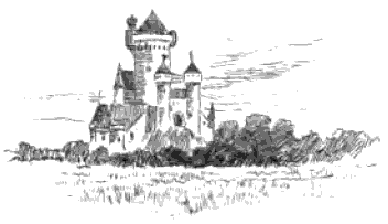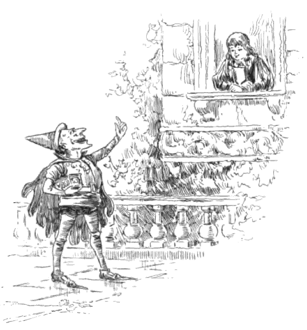 Whatever else might be said of the Blue Wizard, nobody would ever think of calling him a beauty. His nose and his chin were long and pointed, his eyebrows big and bushy, his teeth sharp and protruding from his mouth; and everything about him—skin, hair, teeth, and dress—was as blue as a sky on a June afternoon when not a cloud is to be seen. He had, too, a way of perking his head about, which was most unsettling to the nerves; twitching and twisting it constantly from side to side, like a toy mandarin. He came boldly into the courtyard of the palace, quite as if the whole place belonged to him; and catching sight of Prince Vance at the window above, he raised one finger, long and skinny and blue as a larkspur blossom, and beckoned for him to come down.