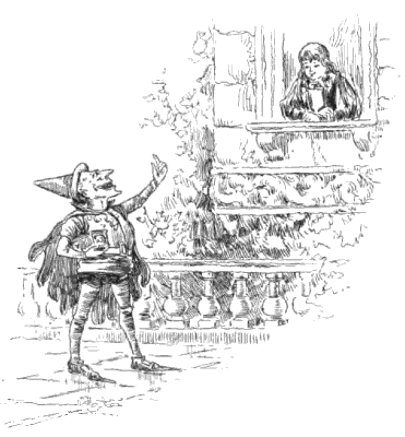 When his pile of books was quite gone, and the blackboard erasers, the bits of crayon, and the pointer had been thrown after them, the Prince put his hands in his pockets and lounged to the window, whistling a tune he had caught from a hand-organ. His twelve younger sisters were just coming into the courtyard, two by two, returning from taking their morning airing with their governesses. The Princesses were quite as good as the Prince was bad, and there could certainly have been no prettier sight than that of the twelve royal little girls walking along so properly and primly. Each had a green velvet pelisse, a neat Leghorn bonnet, and a green fringed parasol; each wore nice buff mitts and a good-tempered smile, and each had a complexion like pink and white ice-cream, and eyes like pretty blue[Pg 19] beads. It was therefore very naughty indeed of Prince Vance to shout "Boh!" so loudly that each Princess started and hopped quite one foot from the ground, and even the governesses put their hands to their hearts. This, however, gave much joy to the Prince; and after his sisters had disappeared he stood by the window still whistling, with his hands in his pockets and a wicked grin on his face.