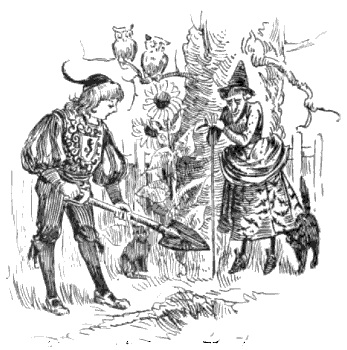 The next morning, after breakfasting with the Wizard, the witch, and the cats, the Prince was called into the garden and given a spade.[Pg 134]