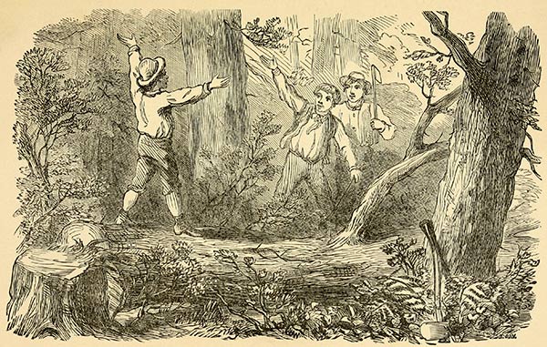Ben had gone into the woods to hew a stick of timber. Sally had just washed up her breakfast dishes, and was singing at her wheel, when suddenly six savage-looking fellows appeared at the door, and ordered her, with curses, to get them some victuals, and be quick about it, too. Sally’s heart was in her throat. She told the leader, who, like his companions, was armed with pistols, and a sailor’s knife in his belt, that she was willing to13 give them breakfast, but they must give her better language, or she should call her husband; upon which, drawing a sheath-knife from his belt, he flourished it in her face, and told her she might call him as soon as she pleased, and he would cut his throat for him.