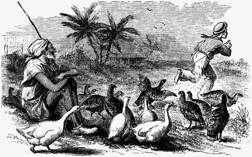 Old Nep had been invited by the negroes to share in the amusements of the holiday, and, arrayed in white pants, waistcoat, and jacket, proceeded to the great house to pay his respects to the ladies in the kitchen. When he arrived old Phil was engaged in a wordy contest with Juan Baptiste. It seems Phil had been whipped at last, for the loss of so many turkeys and pigs, and Juan had been twitting him of it.