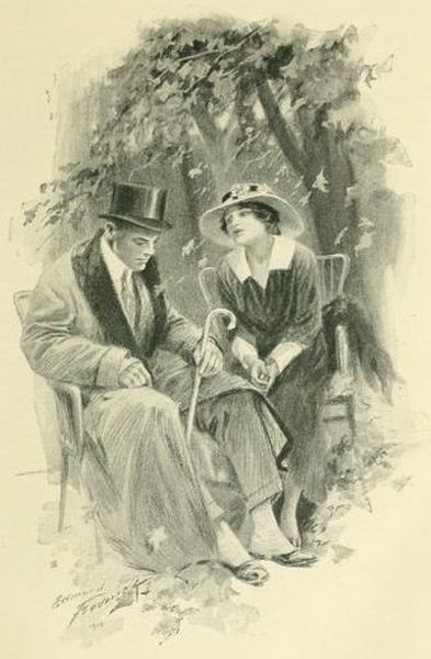 He continued his search for some time without success, and when he reached the edge of the near woods, with their beautiful paths, some of which ran down to a bit of ornamental water just big enough to be called a lake, he stopped, puzzled as to which one to follow. His heart was beating as it had not beat for years. He decided to go straight to the water's edge to a Chinese tea-house which was there, and when he came at length in sight of this, he perceived the flutter of a grey linen skirt disappearing round the corner of it—On the verandah which overhung the water, there were great white water lilies growing in masses just beneath, while two stately swans swam about in the distance; the sun was sinking, it was past six o'clock; and the lights were very lovely and all was serene and still.