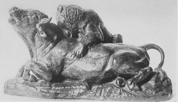 At the Metropolitan Museum of Art are two pictures by the Florentine painter of the fifteenth century called Piero di Cosimo. They represent hunting scenes, and the figures are those of men, women, fauns, satyrs, centaurs, and beasts of the forests, fiercely struggling together. As we observe the lion fastening his teeth in the flesh of the boar, the bear grappling with his human slayer, and the energy and determination of the creatures at bay, our thought involuntarily bridges a chasm of four centuries and calls up the image of the Barye bronzes in which are displayed the same detachment of vision, the same absence of sentimentality, the same vigor and intensity if not quite the same strangeness of imagination. It is manifestly unwise to carry the parallel very far, yet there is still another touch of similarity in the beautiful surfaces. Piero's fine, delicate handling of pigment is in the same manner of expression as Barye's exquisite manipulation of his metal after the casting, his beautiful thin patines that do not suppress but reveal sensitive[Pg 2] line and subtle modulation. We know little enough of Piero beyond what his canvases tell us. Of Barye we naturally know more, although everything save what his work confides of his character and temperament is of secondary importance, and he is interesting to moderns, especially as the father of modern animal sculpture, and not for the events of his quiet life.