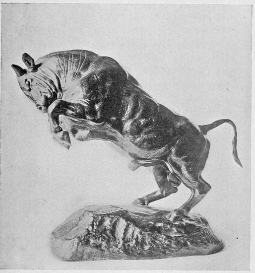 Antoine Louis Barye, born at Paris September 15, 1796, died June 25, 1875, in the same year with Corot and at the same age. The circumstances under which he began his career have been told in detail by more than one biographer, but it would be difficult rightly to estimate the importance and singularity of his work without some review of them. His father was a jeweler of Lyons, who settled in Paris before Antoine was born, and whose idea of education for his son was to place him at less than fourteen with an engraver of military equipments from whom he learned to engrave on steel and other metals, and later with a jeweler from whom he learned to make steel matrixes for molding reliefs from thin metals. A certain stress has been laid on this lack of schooling in the conventional sense of the word, but it is difficult to see that it did much harm, since Barye, though he was not a correct writer of French, was a great reader, keenly intelligent in his analysis of the knowledge he gained from books, and with extraordinary power of turning it to his own[Pg 3] uses. Such a mind does not seriously miss the advantages offered by a formal training, and it might fairly be argued that the manual skill developed at the work-bench was in the long run more valuable to him than the abstract knowledge which he might have acquired in school could possibly have been. Be that as it may, up to the time of his marriage in 1823 he had a varied apprenticeship. At sixteen he was drawn as a conscript and was first assigned to the department where maps in relief are modeled. Before he was twenty-one he was working with a sculptor called Bosio, and also in the studio of the painter, Baron Gros. He studied Lamarck, Cuvier and Buffon. He competed five times for the Prix de Rome at the Salon, once in the section of medals and four times in the section of sculpture, succeeding once (in the first competition) in gaining a second prize. He then went back to the jeweler's bench for eight years, varying the monotony of his work by modeling independently small reliefs of Eagle and Serpent, Eagle and Antelope, Leopard, Panther, and other animals.