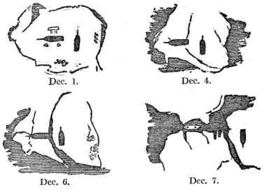 The cause of this sudden disruption—I mean the immediate cause, for the summer influences had prepared the floe for disintegration—was evidently the sea-swell setting from the southeast. This swell had given us minor manifestations of its existence as far back as the 1st of June. Whether it was increased without, or our floe made more accessible to it by the drifting away of other and protecting floes, I can not say. This, however, was clear, that the great undulations propagated by wave action « 360 » caused our disruption. The proof of this I shall not forget.