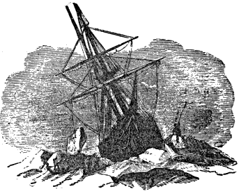 “To add to the novelty of our situation, two cracks coming together obliquely, met a few yards astern of us, cleaving through the heavy ice, and leaving us attached to a triangular fragment of 14 by 22 paces. This berg-like fragment, reduced as it was, continued its close adhesion. Its buoyancy was so great, that it acted like a camel, retaining the brig’s stern high in the air, her bows « 359 » thrown down toward the water. We are so at this moment, 10 P.M."