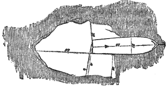“More distant from the cliffs, yet in line with the four already described, is a larger inclosure; the door facing south, and looking toward the strait: this so-called door is simply an entrance made of large stones placed one above the other. The inclosure itself triangular; its northern side about eighteen inches high, built up of flat stones. Some bird bones and one rib of a seal were found exactly in the centre of this triangle, as if a party had sat round it eating; and the top of a preserved-meat case, much rusted, was found in the same place. I « 34 » picked up a piece of canvas or duck on the cliff side, well worn by the weather: the sailors recognized it at once as the gore of a pair of trowsers.