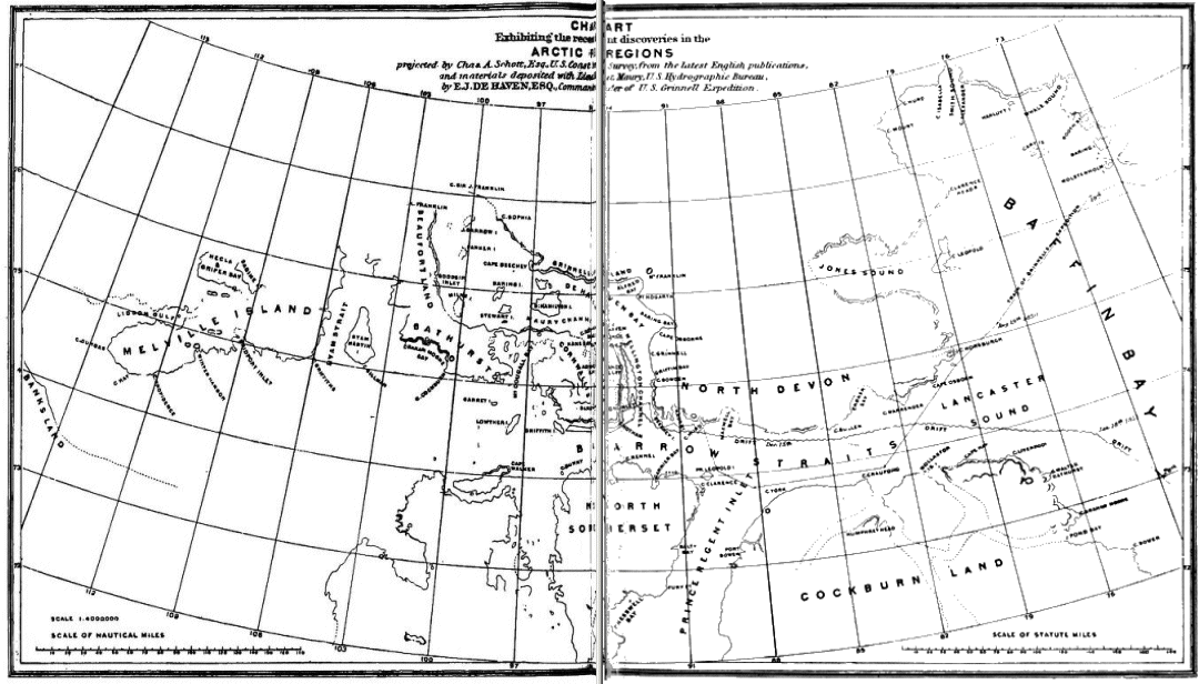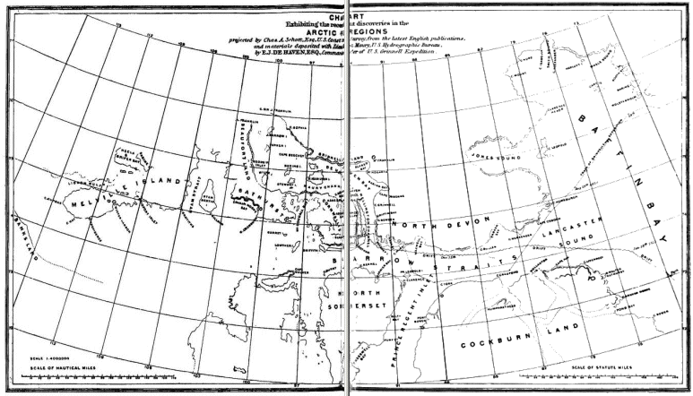 On August 18th they passed the ice barrier of Baffin Bay, and bore away southwesterly towards Lancaster Sound, in more open water than they had seen for weeks. Several British rescue squadrons were known to be somewhere in these waters, including a number of steamers, but De Haven and his associates were ignorant of their course and intended scheme of search.