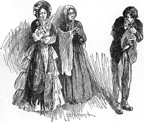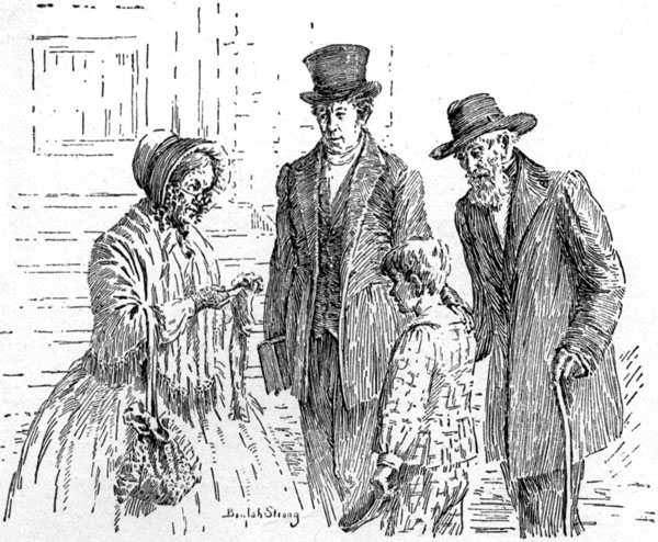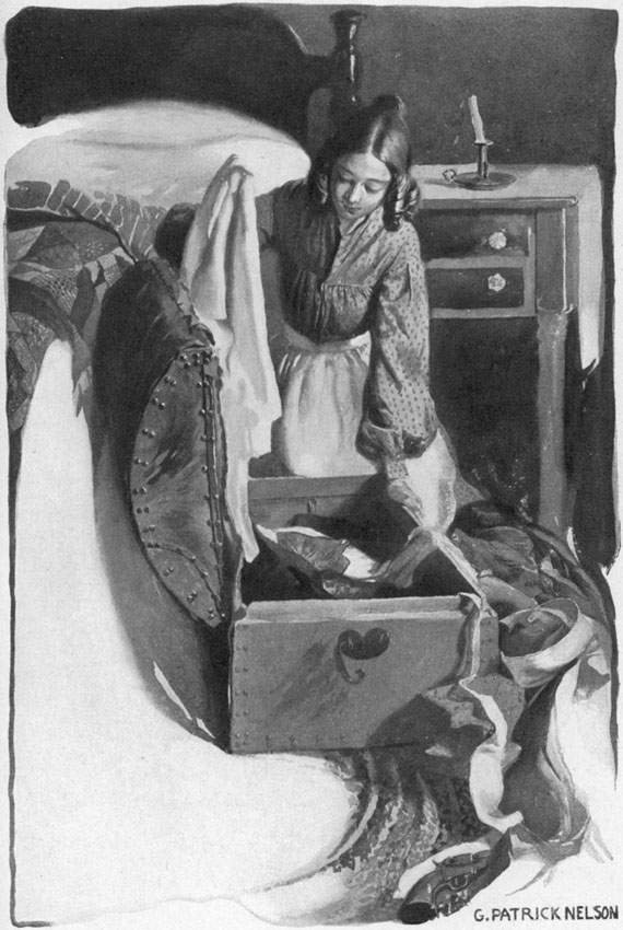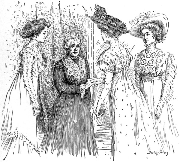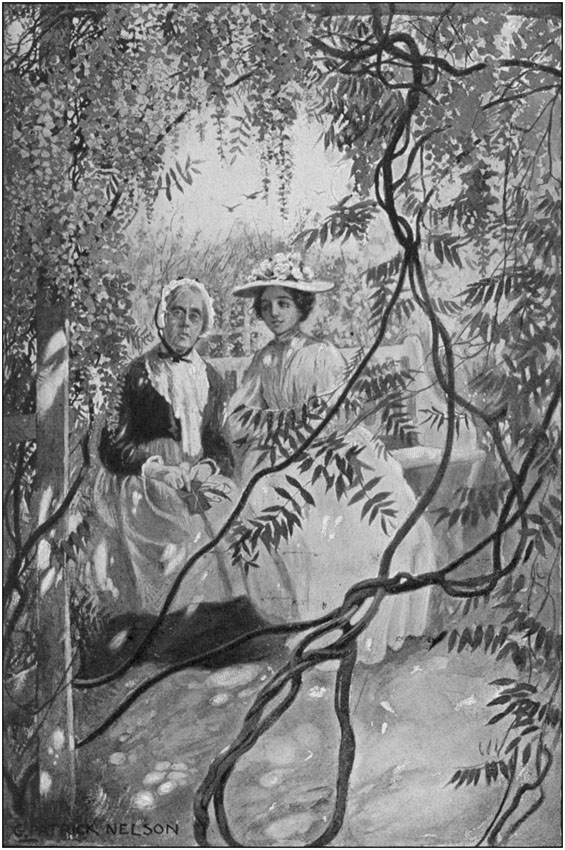 Aunt Jane came out of the house, drawing on a pair of silk gloves. She was arrayed in her best gown of black alpaca, a silk-fringed cape covered her shoulders, her poke bonnet was draped with a veil of [4]figured lace, and under the lace her face shone with happy anticipation, for a lifetime of trips to town had not dulled her enjoyment of such an event.