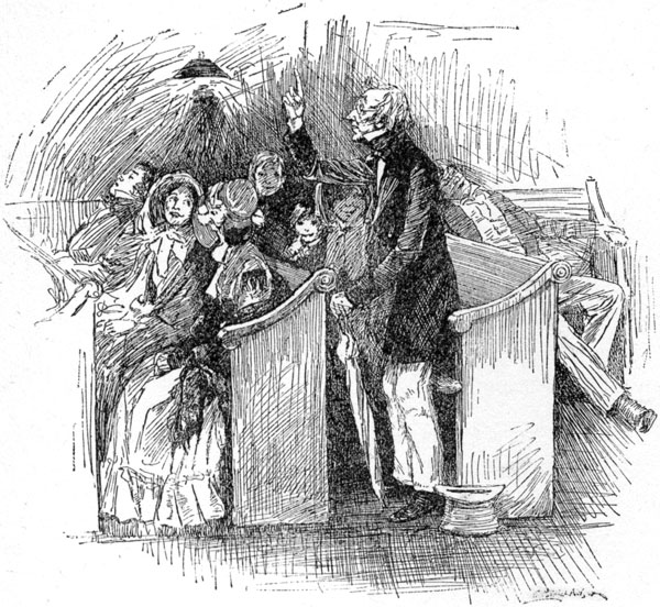 "Well, Parson Page he got up and went up the pulpit steps—I ricollect he had to step over Martin Luther's legs; Martin Luther was lyin' over on his face sound asleep—and he stooped down and looked at the clock, and then he threw up his hands and says he: 'Why, bless my soul! It's nearly one o'clock.'