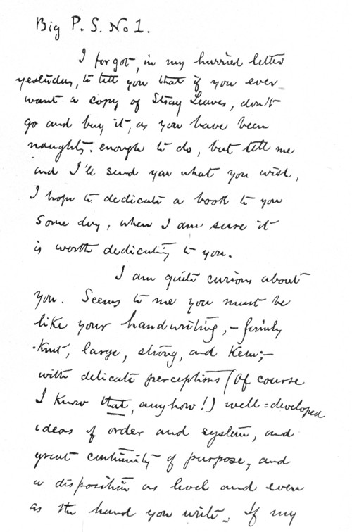 I have a book for you—an astounding book,—a godlike book. But I want you to promise to read every single word of it. Every word is dynamic. It is the finest book on the East ever written; and though very small contains more than all my library of Oriental books. And an American (?) wrote it! It is called “The Soul of the Far East.” It will astound you like Schopenhauer, the same profundity and lucidity. Love to you,