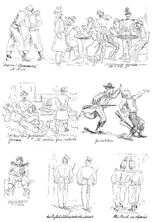We went back to Genoa, viâ Jersey (as a little détour!) Poor old Agostino, our inevitable cook, saw us as we drove from the station, on our arrival, through the Via Carlo Felice. Worse luck, for he had become too blind for his work. In days gone by he had done very well and we had not the heart to cast him off. He ran after our carriage, kissing our hands as he capered sideways alongside, at the peril of being run over. So we were in for him again, but it was the last time. On our next visit a friend told us, “Agostino is dead, thank goodness!” He and our dear nurse, Amélie, used to have the most desperate rows, principally over religion, he a devout Catholic and she a Protestant of the true Swiss fibre. They always ended by wrangling themselves at the highest pitch of their voices into papa’s presence for judgment. But he never gave it, only begging them to be quiet. She declared to Agostino that if he got no wages at all he would still make a fortune out of us by his perquisites; and, indeed, considering we left all purchases in his hands, I don’t think she exaggerated. The war against Austria had been won. Magenta, Solferino, Montebello—dear me, how those names resounded! One day as we were running along the road in our pinafores near the Zerbino palace, above Genoa, along came Victor Emmanuel in an open carriage looking very red and blotchy in the heat, with big, ungloved hands, one of which he raised to his hat in saluting us little imps who were shouting “Long live the King of Italy!” in English with all our might. We were only a little previous (!) Then the next year came the Garibaldi enthusiasm, and we, like all the children about us, became highly exalted Garibaldians. I saw the Liberator the day before he sailed from Quarto for his historical landing in Sicily, at the Villa Spinola, in the grounds of which we were, on a visit at the English consul’s. He was sitting in a little arbour overlooking the sea, talking to the gardener. In the following autumn, when his fame had increased a thousandfold, I made a pen and ink memory sketch of him which my father told me to keep for future times. I vividly remember, though at the time not able to understand the extraordinary meaning of the words, hearing one of Garibaldi’s adoring comrades (one Colonel Vecchii) a year or two later on exclaim to my father, with hands raised to heaven, “Garibaldi!! C’est le Christ le revolver à la main!”