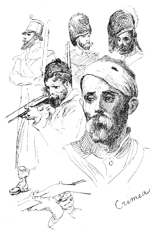In London I took in all the amusing details of the London streets, so new to me, coming from Italy. I seem, by my entries in the Diary, to have been particularly diverted by the colour of those Dundreary whiskers that the English “swell” of the period affected. I constantly come upon “Saw no end of red whiskers.” Then I read, “Mamma and I paid calls, one on Dickens (sic)—out, thank goodness.” Charles Dickens, whom I dismiss in this offhand manner, had been a close friend of my father’s, and it was he who introduced my father to the beautiful Miss Weller (amusing coincidence in names!) at an amateur concert where she played. The result was rapid. My vivid memory can just recall Charles Dickens’s laugh. I never heard it echoed by any other man’s till I heard Lord Wolseley’s. The volunteer movement was in full swing, and I became even more enthusiastic over the citizen soldiers than I had been over the Garibaldini. Then there are pages and pages filled with descriptions of the pictures at the Royal Academy; of the Zoological Gardens, describing nearly every bird, beast, reptile and fish. Laments over the fogs and the cold of that dreadful London April and May, and untiring outbursts in verse of regret for my lost Italy. But I stuffed my sketch books with British volunteers in every conceivable uniform, each corps dressed after its own taste. There was a very short-lived corps called the Six-foot Guards! I sent a design for a uniform to the Illustrated London News, which was returned with thanks. I felt hurt. Grandpapa attached himself to the St. George’s Rifles, and went, later on, through storm and rain and sun in several sham fights. Well, Punch made fun of those good men and true, but I have lived to know that the “Territorials,” as they came to be called, were destined in the following century to lend their strong arm in saving the nation. We next had a breezy and refreshing experience of Hastings and the joy of rides on the downs with the riding master. London fog and smoke were blown off us by the briny breezes.